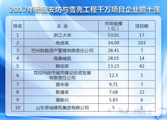 據(jù)ITS114不完全統(tǒng)計,2017年我國安防(政府需求類視頻監(jiān)控)與雪亮工程千萬項目市場規(guī)模約為423.65億,項目數(shù)705個,千萬項目平均投資約為6008.31萬。截止2017年12月底,我國安防與雪亮工程千萬項目前十企業(yè)市場規(guī)模總計約為197.27億,約占安防與雪亮工程千萬項目總市場的46.56%。與2016年相比,我國安防與雪亮工程千萬項目市場規(guī)模增長了約240億,增長率為136.86%。